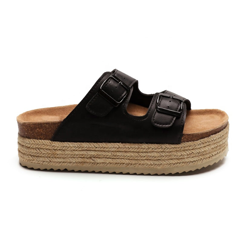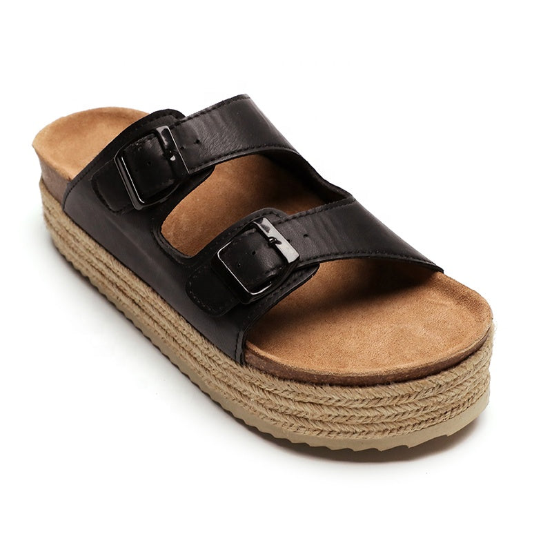 Te damskie pantofle na platformie z podwójnym paskiem łączą w sobie swobodny styl z podwyższoną podeszwą. Regulowane klamry dodają im charakteru, dzięki czemu nadają się do noszenia na co dzień lub na nieformalne wyjścia.